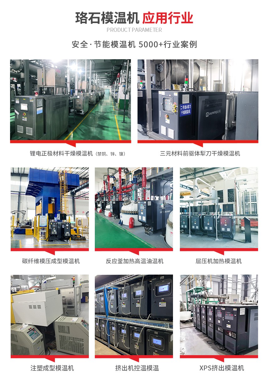 ?電加熱模溫機廣泛用于控溫精度和安全性要求較高的化工制藥領域、航天航空復合材料成型模具、壓板控溫,新能源鋰電材料干燥、混合機控溫以及太陽能光伏熱壓機加熱控溫等。